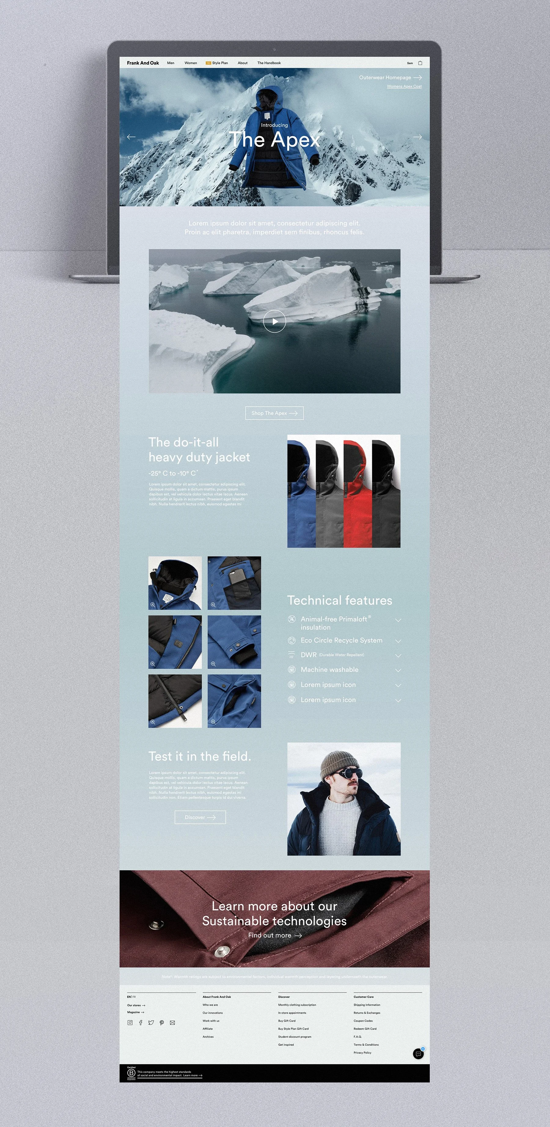 Landing page for the launch of the collection’s second instalment: the Apex Technical Winter Parka as the warmest sustainable outerwear piece of the collection made from recycled polyester and cruelty-free filling.